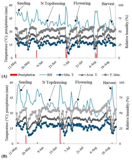 Maximum, average and minimum temperatures and precipitation and the relative humidity during the winter growth periods of the common bean in 2019 (A) and 2020 (B).