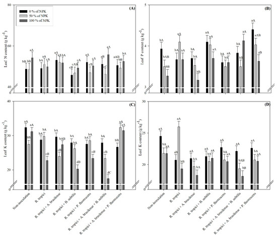 The current results exhibited that the leaf N concentration of the common bean increased following the 100% dose of NPK fertilizer and co-inoculation with R. tropici + A. brasilense + B. subtilis and R. tropici + A. brasilense and the 0% dose of NPK and co-inoculation with R. tropici + A. brasilense and R. tropici + P. fluorescens (Table 1; Figure 2A). This could be due to the greater expansion of the root system, which is stimulated by plant growth-promoting bacteria (PGPB). In addition, N has a great interference on the development and grain yield of bean plants because it is the most exported nutrient by plants; therefore, an increase in leaf N concentration is due to its availability in the rhizosphere region, which is affected by biological N fixation and the exploration capacity of the roots [21]. It has also been reported that different PGPB are able to colonize in root rhizospheres that have higher levels of nutrient transportation and concentration in the plants [22].
