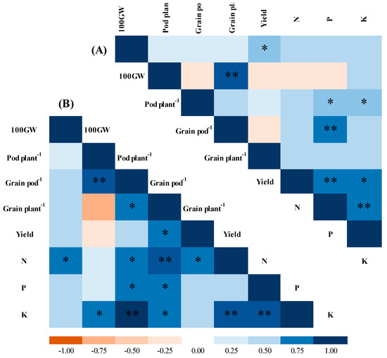 Heatmap of Pearson’s correlation coefficients obtained from the analyzed variables of the common bean in response to NPK doses and co-inoculation with PGPB in common bean seeds in 2019 (A) and 2020 (B): ** significant correlation (p < 0.01); * significant correlation (p < 0.05); 100 GW, hundred-grain weight; YIELD, grain yield; N, leaf nitrogen content; P, leaf phosphorus content; K, leaf potassium content.