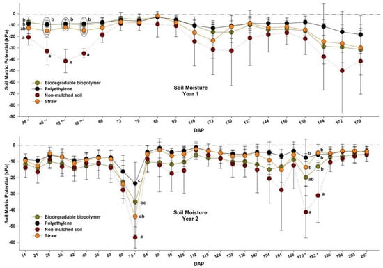 Soil matric potential (kPa) during the two crop seasons (weekly averages) depending on mulch type and in non-mulched soil. Values (mean ± standard deviation; n = 3). Different letters in the same week indicate significant differences (p ≤ 0.05, Fisher’s LSD test). ‘*’, ‘**’, and ‘***’ indicate significance at p ≤ 0.05, 0.01, and 0.001, respectively. DAP: Days After Planting.