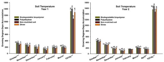 In the first year, Total Growing Degree-Days Accumulation for the whole crop season showed a significant increase (p < 0.05) when soil mulches were used compared to non-mulched soil, whereas no differences (p > 0.05) were detected among soil mulches (Figure 3, Year 1). Total Growing Degree-Days Accumulation for the whole crop season were 1406, 1324, 1297, and 1096 for polyethylene, biodegradable biopolymer, straw, and non-mulched soil, respectively. In general, the same trend was observed from October to January (included) when results were considered as the Monthly Growing Degree-Days Accumulation. However, values in February and March were higher in the soil with polyethylene mulch (205 and 217, respectively) compared to the rest of the treatments, whereas biodegradable mulches (183 in February and 200 in March) and straw (175 in February and 176 in March) did not show differences compared to non-mulched soil (155 in February and 196 in March).