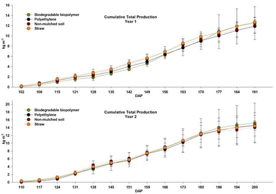 Cumulative tomato production in the two years of study depending on mulch type and for non-mulched soil. Values (mean ± standard deviation; n = 3). DAP: Days After Planting.