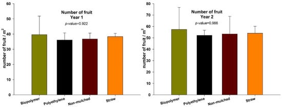 Similarly, soil mulch did not significantly influence the number of fruits per m2, with average values ranging from 36.1 to 39.6 fruits m−2 and 52.2 to 57.4 fruits m−2 in Years 1 and 2, respectively (Figure 5). In this regard, it should be noted that the differences in production and number of fruits between the two years of study (higher values in the second year in both cases) may be mainly due to the fact that in the second year the crop cycle was longer.