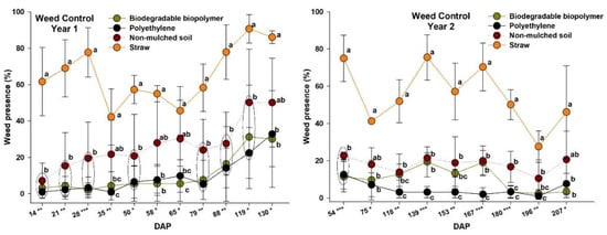 Weed presence during the two crop seasons depending on mulch type and for non-mulched soil. Values (mean ± standard deviation; n = 3). Different letters in the same week indicate significant differences (p ≤ 0.05, Fisher´s LSD test). ‘*’, ‘**’, and ‘***’ indicate significance at p ≤ 0.05, 0.01, and 0.001, respectively. DAP: Days After Planting.