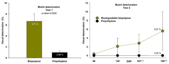 Figure 7 represents the visual deterioration of plastic mulches (polyethylene and biodegradable biopolymer) at the end of the tomato crop cycle and for the Year 2 cycle, referring to the percentage of deterioration over the total area evaluated. It should be noted that, although mulch visual deterioration assessments (PVD) are generally related to changes in certain mechanical properties of the mulch (e.g., resistance and elongation percentage at break point) [65,66], visual assessment and mechanical properties provide different information on deterioration. In the present study, at the end of the tomato crop season, the visual deterioration of the biodegradable mulch was significantly higher (p < 0.05) compared to polyethylene mulch in both years, reaching average values in biodegradable mulch of 6.70% and 5.61% in Years 1 and 2, respectively, compared to 0.98% and 0.02% for polyethylene mulch (Figure 8). In the second year, significant differences were detected from 161 DAP.