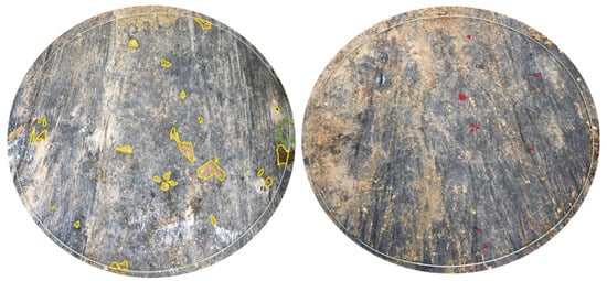 Visual deterioration of biodegradable biopolymer ((left); deteriorated area in yellow color) and polyethylene ((right); deteriorated area in red color) plastic mulches at the end of the crop season in Year 2 (195 days after planting). Surfaces occupied by the ring (1 m2) were processed with software to obtain the deteriorated area (perforations and/or breaks).