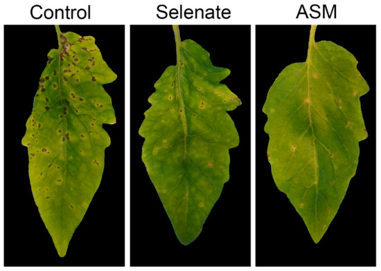 Protective effect of sodium selenate (4 ppm; 21.17 µM) on tomato leaves against Pseudomonas syringae pv. tomato 14 days after the inoculation. Tomato leaves of control sodium selenate- and acibenzolar-S-methyl- (ASM) treated plants.
