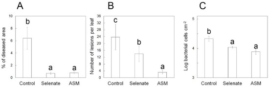 Protective effect of sodium selenate (4 ppm; 21.17 µM), and acibenzolar-S-methyl (213.98 µM; ASM) for comparison, on disease severity of Pseudomonas syringae pv. tomato (Pst) on tomato plants, expressed as % of leaf diseased area (A), and number of lesions per leaf at 14 days post-inoculation (B), as well as Pst growth in planta at 6 days post-inoculation (C). Data for each column represent the means of 10 (A,B) and 4 (C) replicates ± SE. Data of each plot followed by the same letters are not significantly different according to the Duncan’s multiple range test at p = 0.01 (A,B) and p = 0.05 (C).