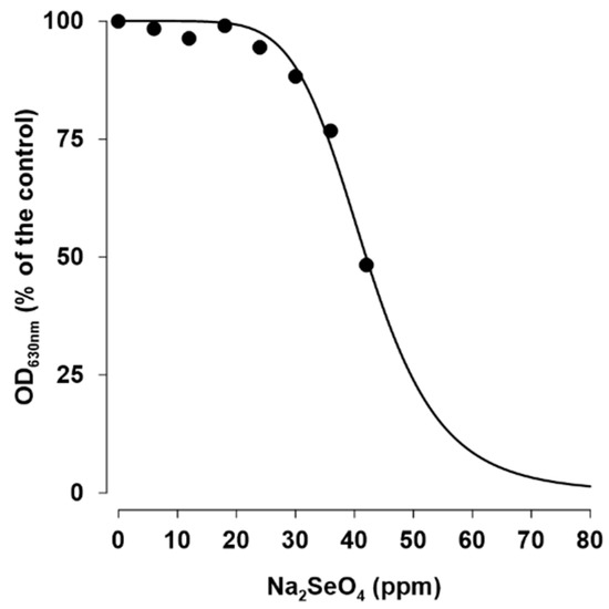 The in vitro activity of different concentrations of sodium selenate on Pst growth was expressed as OD630 relative to the control (%) and fitted well with the log-logistic curve reported in Equation (2) (Figure 3):