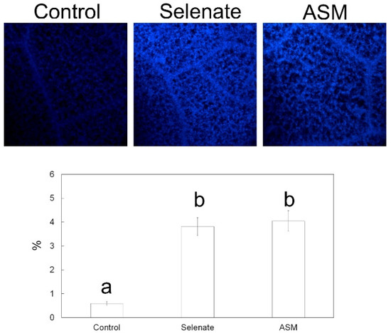 Callose accumulation in tomato leaves at 48 h post-treatment (hpt) with water (control), sodium selenate (4 ppm; 21.17 µM) and acibenzolar-S-methyl (213.98 µM; ASM). Callose was visualized by aniline blue staining and epifluorescence. Quantification was carried out by determining the percentage (%) of blue pixels on digitalized photos. Each experiment was independently repeated three times, with three plants per treatments, three pieces from the first leaflet of the 2nd true leaf of the tomato plants and one photograph taken at random for each piece. Data from the three experiments were submitted to one factor (treatment) analysis of variance (ANOVA). Each column represents the mean of 27 replicate photos per treatment ± SE. Different letters indicate significant differences (p ≤ 0.01, Duncan’s tests). Top: representative digitalized photograph areas at 10× magnification of blue pixels corresponding with each bar.