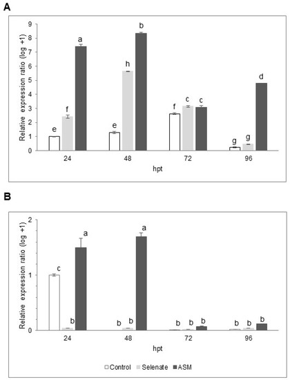 In sodium selenate and ASM treated tomato plants, significant expression of the salicylic-acid-responsive PR1b1 gene was observed at 24, 48 and 72 htp, with the maximum of expression at 48 htp (Figure 6A). At 96 hpt, PR1b1 induction by ASM was also significant. Conversely, a significant reduction was observed for the jasmonate-mediated PIN2 gene expression in sodium selenate treated tomato plants but not for ASM (Figure 6B).