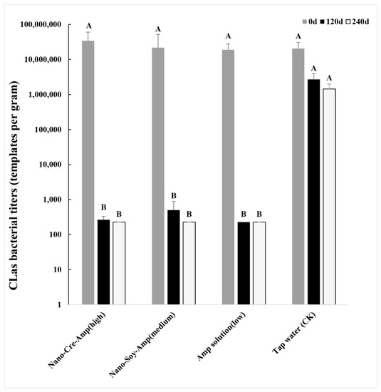 Clas titer in HLB-affected citrus in response to different concentration of Amp (Nano-Cre-Amp (high), Nano-Soy-Amp (medium), Amp solution (low), and tap water (CK)) Different letters represent significant differences at the level of 0.05 (Duncan’s multiple range tests) (p < 0.05). Error bars indicate standard deviation. Six replicates in each treatment.