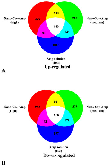 In the GO annotation, 379, 329, and 801 up-regulated DEGs were identified in Nano-Cre-Amp (high), Nano-Soy-Amp (medium), and Amp solution (low), respectively. In addition, 371, 412, and 803 down-regulated DEGs, respectively, were annotated in these three treatments. These DEGs were assigned to at least one term in the GO biological process, cellular component, and molecular function categories. In the cellular component categories, cell part, organelle, cell, and membrane were the most highly represented groups for both up-regulated and down-regulated DEGs (Tables S3 and S4). In molecular function categories, most up-regulated and down-regulated DEGs were enriched in binding and catalytic activity, whereas cellular process, single-organism process, and metabolic process dominated biological processes (Tables S3 and S4).
