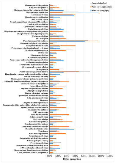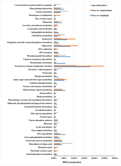 The KEGG pathway database was used to identify metabolic pathways in which Nano-Cre-Amp (high), Nano-Soy-Amp (medium), and Amp solution (low) were involved and enriched. In this study, KEGG analysis assigned the DEGs to 114 metabolic pathways. Most up-regulated DEGs were enriched in protein processing in the endoplasmic reticulum pathway (DEG proportion > 10%), followed by biosynthesis of amino acids, starch and sucrose metabolism, plant hormone signal transduction, amino sugar and nucleotide sugar metabolism, spliceosome, endocytosis, carbon metabolism, and plant-pathogen interaction (DEG proportion > 3%) (Figure 5). On the other hand, most down-regulated DEGs were enriched in plant hormone signal transduction, glycolysis/gluconeogenesis, phenylpropanoid biosynthesis, and carbon metabolism (DEG proportion > 3%) (Figure 6).