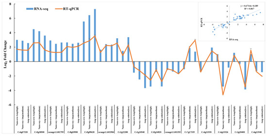 To confirm our transcriptomic data, 15 DEGs were selected for RT-qPCR. All 15 DEGs showed a change in transcript abundance in the RT-qPCR assay that was in accordance with that seen with RNA-seq. The results indicated that the change of transcript abundance of the 15 DEGs determined by RT-qPCR was the same as that detected by RNA-seq (Figure 7). The correlation coefficient (R2) between RT-qPCR and RNA-seq was >0.85 (Figure 7), indicating that the transcriptomic data were reliable.