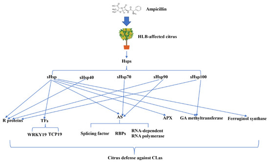 Overview of the relationship between Hsps and defense genes in HLB-affected citrus in response to Amp treatment.