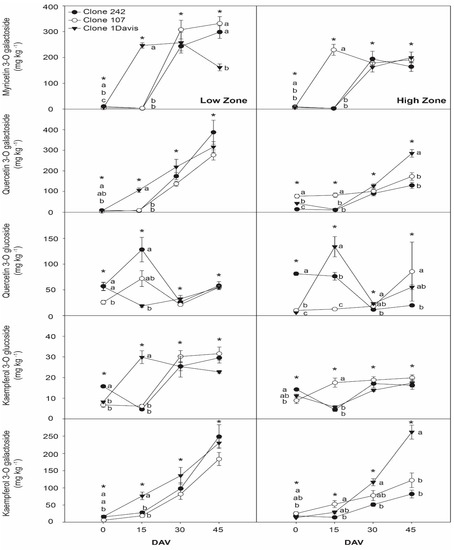 Evolution of principal flavonols in grape skins from cv. Sauvignon Blanc clones 242, 107, and 1-Davis throughout ripening from two zones of Casablanca Valley. Different lowercase letters indicate significant differences (p < 0.05) between different clones from the same zone in the same sampling date according to Tukey’s HSD test. * indicate significant difference (p < 0.05) between the same clones from different zones in the same sampling date according to Tukey’s HSD test. DAV: days after veraison.
