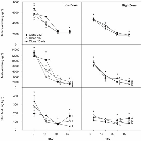 Evolution of principal organic acids in grapes from cv. Sauvignon Blanc clones 242, 107, and 1-Davis throughout ripening from two zones of Casablanca Valley. Different lowercase letters indicate significant differences (p < 0.05) between different clones from the same zone in the same sampling date according to Tukey’s HSD test. * indicate significant difference (p < 0.05) between the same clones from different zones in the same sampling date according to Tukey’s HSD test. DAV: days after veraison.