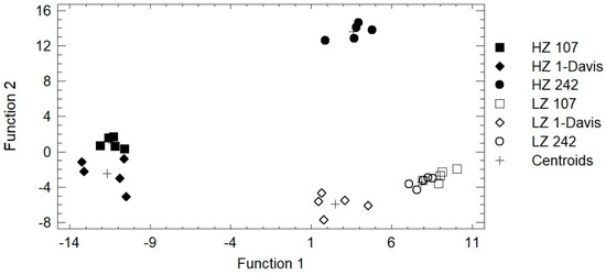 Linear discriminant analysis from the chemical composition of cv. Sauvignon Blanc clones 242, 107, and 1-Davis from the Casablanca Valley at the last sampling date. HZ: high zone; LZ: low zone.