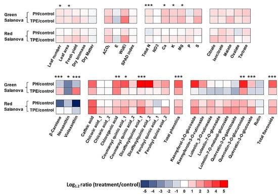The enhanced absorption of certain nutrients (N, K, Ca, and Mg) by only the green cultivar could be related with the increase in green salanova’s total N (%) after the application of PH and TPE biostimulants. In contrast, the two biostimulants reduced (PH) or did not have an effect (TPE) on the total N (%) of red lettuce. Several studies have highlighted an increase in the metabolism and assimilation of nitrogen, and the enzymes involved (nitrate reductase, nitrite reductase, glutamine synthetase, glutamate synthase, and aspartate aminotransferase), following the application of protein hydrolysates [