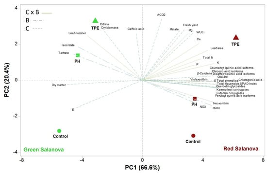 Principal component analysis provided a comprehensive framework for evaluating the two biostimulants’ effects on green and red lettuce cultivar yields and the modulation of primary and secondary metabolism. The two cultivars were clearly separated via the PCA. However, PCA analysis confirmed that several primary and secondary compounds were subjected to cultivar × biostimulant interaction since only green lettuce biostimulant treatments (PH and TPE) were grouped in the same positive quadrant of PC2. The latter verified our previous results indicating that the effects of biostimulant application may differ depending on lettuce cultivar types.