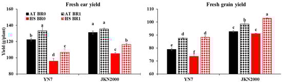 The fresh ear yield ranged from 122.4 to 135.5 g/plant and from 95.8 to 116.5 g/plant at AT and HS, respectively. Post-silking HS decreased the ear yield by 21.8% and 19.8% without BR application, and by 19.9% and 14.0% with BR application, in YN7 and JKN2000, respectively (Figure 1). This result is consistent with that from crops harvested at maturity [,]. Smaller ear size under HS has also been reported in normal maize []. The fresh grain yield was reduced by 6.9% in YN7 and unaffected in JKN2000 after plants suffered from HS without BR application. With BR application, the fresh grain yield was unaffected in YN7 and increased by 4.4% in JKN2000 under HS condition. The result was consistent with previous findings on fresh waxy maize [], but contrary to plants harvested at maturity under HS condition []. The discrepancy can be attributed to the accelerated grain-filling rate under HS, as grain weight gradually increased with the development [].