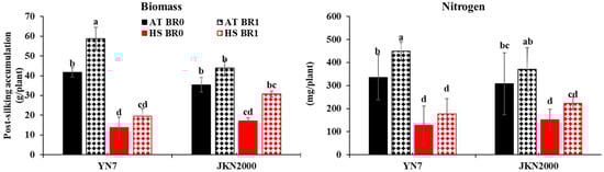 High biomass and nitrogen accumulation are the target traits in crops to improve grain yield []. The post-silking biomass and nitrogen accumulation were 35.4–58.7 g/plant and 307.9–449.2 mg/plant under AT, and 13.6–30.7 g/plant and 128.0–222.5 mg/plant under HS. These findings indicate that the biomass and nitrogen accumulation were reduced by HS regardless of whether the plants were sprayed with BR or not (Figure 2). For YN7 and JKN2000, respectively, the biomass was reduced by 67.3% and 51.8% without BR application, and by 66.7% and 30.1% with BR application; the nitrogen accumulation was reduced by 61.9% and 50.5% without BR application, and by 60.4% and 39.9% with BR application, when plants suffered from HS. HS reduced biomass and nitrogen were also reported on waxy maize [] and wheat [] harvested at maturity, and this phenomenon may be caused by the decreased photosynthetic rate, accelerated leaf senescence, and weakened carbon–nitrogen metabolism [,,]. A study on wheat showed that stem water-soluble carbohydrate and nitrogen accumulation in response to HS depends on the cultivar []. Another study on rice showed that a 2 °C increase after transplanting improves the biomass and nitrogen accumulation for the whole plant but decreases it for the grain []. This discrepancy is caused by differences in heat duration, stage, and degree, and genotypic differences in thermotolerance.