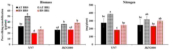 Effects of foliar BR application at the silking stage on post-silking remobilization of biomass and nitrogen of fresh waxy maize under post-silking ambient and high temperatures. AT, ambient temperature; HS, heat stress; BR0, application of water; BR1, application of 0.25 mg/L BR. The different letters on the column mean the difference was significant at the p < 0.05 level.