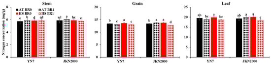 The nitrogen concentration (NC) in the stem, leaf, and grain among different treatments was 5.7–6.0, 12.8–13.7, and 18.3–19.9 mg/g, respectively (Figure 4). The stem NC was increased by HS in YN7 (1.8%) and unaffected in JKN2000 without BR application. With BR application, stem NC was decreased in both hybrids (Figure 4). This result was consistent with the change trend in the remobilization of pre-silking nitrogen in the stem, but the pre-silking stem biomass was increased by HS without BR application. The higher remobilization of biomass than of nitrogen resulted in high stem NC. The different response between the two hybrids may be because the remobilization of nitrogen was unaffected in JKN2000, and pre-silking nitrogen was increased in YN7. The leaf NC was unaffected by HS in both hybrids without BR application. With BR application, the leaf NC was unaffected by HS in YN7 and reduced in JKN2000. The grain NC was increased by HS in both hybrids without BR application. This result was consistent with studies on mature cereal crops [,]. The grain NC may have increased because the effect of HS on carbon/starch accumulation was more severe than that of nitrogen [,]. With BR application, the grain NC was reduced by HS in JKN2000 and unaffected in YN7. A study on rice observed that ear NC was unaffected by HS, whereas the NC in the stem, leaf, and root was increased []. However, another study reported that rice leaf NC was unaffected by HS, but stem and grain NC were reduced at maturity []. An increase of 2 °C improves the grain and shoot NC in rice []. In normal maize, HS does not affect the NC in all plant parts []. In wheat, the leaf NC is reduced, but stem and spike NC depend on the cultivar after the plant suffers from HS []. The different changes in NC in different organs indicate that the nitrogen remobilization is dependent on the HS stage, duration, and degree.