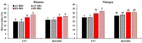 Effects of foliar BR application at the silking stage on harvest index of biomass and nitrogen of fresh waxy maize under post-silking ambient and high temperatures. AT, ambient temperature; HS, heat stress; BR0, application of water; BR1, application of 0.25 mg/L BR. The different letters on the column mean the difference was significant at the p < 0.05 level.