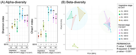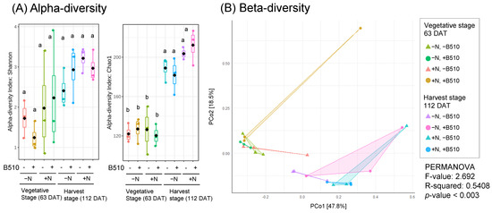 Influence of B510 on root-colonized microbiota with different levels of N-fertilizer and two stages of plant development. Measurement of the alpha-diversity (A) and beta-diversity (B) of the rice root-colonized bacteria. Rice plants inoculated with B510 (+) and without B510 (−), and fertilized with chemical nitrogen (+N) and non-fertilized (−N) harvested at the vegetative stage (63 DAT) and the harvest stage (112 DAT). (A) Shannon index and Chao1 index were used in the analysis of the alpha diversity. All values are means of three replicates ± standard errors. Statistical analysis was performed, different letters indicate significant difference between treatments (Student-Newman-Keuls [SNK] test, p < 0.05, n = 3). (B) Principal Coordinate Analysis (PCoA) are plotted based on Bray-Curtis distance metrices for taxonomical data (p < 0.01). Permutational multivariate analysis of variance (PERMANOVA) was performed.