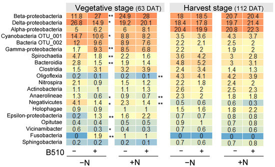 Heat Map of the top 20 bacterial species associated with rice roots at the vegetative stage (63 DAT) and harvest stage (112 DAT). The heat-maps show the relative abundances of bacterial operational taxonomic units (OTUs) at the class level from rice plants inoculated with B510 (+) and without B510 (−) and with supplemental nitrogen fertilizer (+N) and without N-fertilizer (−N). The color of the heat-map indicates the relative abundance from high (red) to low (blue). The asterisks identify significant differences between B510-inoculated (+) and without B510 (−) analyzed by the unpaired two-tailed Student’s t-test (* p < 0.05, ** p < 0.01).