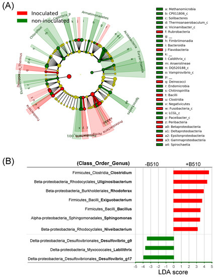 Linear discriminant analysis effect size (LEfSe) method identifies the significantly different (p < 0.05, Kruskal-Wallis test) bacteria at multiple taxonomic levels by comparing the community composition of non-inoculated and B510-inoculated rice roots in the non-fertilized (−N) condition. (A) A bacterial cladogram identifying the taxa with significantly different abundances between treatments are represented by colored Phylum, Class, Order and Family levels. The colored shadows represent trends of the significantly different taxa, B510-inoculated (red) and B510 non-inoculated (green). (B) LDA scores showed significant differences resulting from B510-inoculation. The red bars represent the significantly increased taxa, and green bars represent the decreased taxa resulting from B510-inoculation.