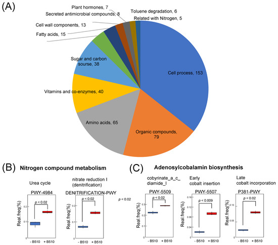 Functional composition profiles of bacterial communities. Bacterial communities were analyzed by PICRUSt2. Rice samples with significant differences (p < 0.05) between those inoculated with and without B510 in the non-nitrogen fertilized condition. (A) Number of pathways selected in each category by PICRUSt2. (B) Real frequency (%) of nitrogen compound metabolism, and (C) real frequency (%) of cobalamin-related pathways as a function of B510 treatment.