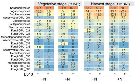 To identify the effect of B510 inoculation on the fungal community structure, we analyzed amplicons using the fungal ITS primer. The α-diversity analysis showed that the Shannon and Chao1 index was not significantly different among the treatments (Figure 5A, Table S3). However, there was a significant difference between the vegetative and harvest stages in the Chao1 index (Table S3). Although B510 inoculation affected the bacterial α-diversity, the fungal α-diversity was not affected by nitrogen application or B510 inoculation. The beta-diversity of PCoA indicated that the samples were divided into two groups, the vegetative stage and the harvest stage, but there was no apparent difference among the treatments (Figure 5B). The heatmap showed that Sordariomycetes were abundant in all of the treatments (more than 68% in the vegetative stage and more than 50% in the harvested stage). Although the relative abundance of Agaricomycetes was highest in the non-inoculated −N condition (16.5%) in the vegetative stage, the levels of this fungus in the B510 inoculation and +N treatments were much lower (4.5%, 5% and 3.6%, respectively) (Figure 6). In contrast, the relative abundance of Ustilaginomycetes was 0.5% in the non-inoculated −N condition, but that value increased in the B510 inoculation treatment (1.1%), the non-inoculated (+N) treatment (0.9%) and the B510-inoculated (+N) condition (1.7%) without significant differences (Figure 6). To identify the unique fungal taxa that are significantly related to B510 inoculation, the fungal community was depicted using an LDA score >2.5 (Figure S3). The abundance of Amanita, Pseudeurotium, Cordyceps, Coinella and Valsonectria increased as a result of B510 inoculation.