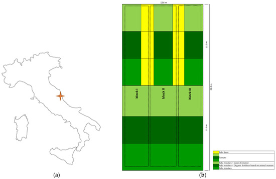 The experiment was conducted in 2018 and 2019 in the Monsampolo Vegetables organic certified Long-Term Experiment (MOVE.LTE) located in Monsampolo del Tronto (AP), Italy (42°53′ N, 13°48′ E). Climate is classified as thermo-Mediterranean [24] with annual precipitations accounting for about 564 mm and average air temperature for 9 °C and 20 °C in October–March and April–September, respectively. Soil is classified as typic Calcixerepts fine-loamy and mixed thermic [25]. The three-blocks experimental design compared monocropped (MC) faba bean (Vicia faba L., local cv “Fratterosa”, FB) and tomato (Solanum Lycopersicum L., local cv “SAAB CRA”, T), to faba bean–tomato strip-cropping (SC) in 2.8 m × 3.7 m plots (Figure 1). Row distance accounted for 0.7 m for both crops, while plant distance accounted for 0.2 and 0.5 for faba and tomatoes, respectively. Faba was sown in November after ploughing and arrowing in all the experimental plots. Following the harvest of the fresh faba pods (first week of May 2018 and 2019), faba bean was terminated by flattening using a roller crimper in the plots where the tomato would have been transplanted (tomato MC plots and tomato SC strips). In all the faba bean MC plots and in SC strips, the legume remained in field up to half July 2018 and 2019 until dry grain harvesting, while in tomato MC plots and SC strips, the flattened faba bean residues (FF) formed a green mulch, where tomato was transplanted in rows. Consequently, N input from FF was always considered as additional N supply to N added with organic fertilizers to tomato plants.