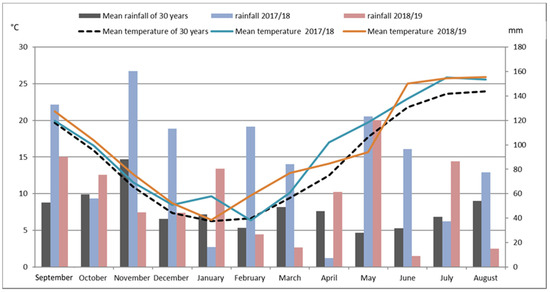 Rainfall (mm) and temperature (°C) during the experimental years; mean monthly rainfall and temperature over 30 years.