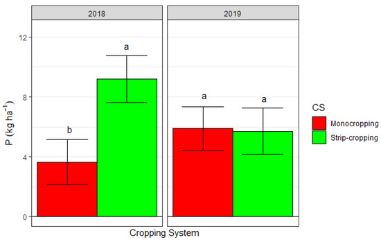 Available-P (mg kg−1) under monocropping and strip cropping in 2018 and 2019. Treatments indicated by different letters are significantly different at p < 0.05 (Tukey test). Bars denote standard errors of the mean.