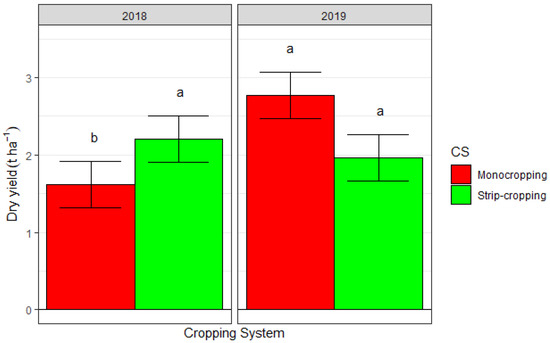 Tomato dry yield (dry matter t ha−1) under mono-cropping (MC) and strip-cropping (SC) in 2018 and 2019. CS stands for Cropping system. Treatments indicated by different letters are significantly different at p < 0.05 (Tukey test). Bars denote standard errors of the mean.