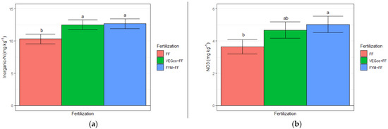 Total soil inorganic-N (mg kg−1) (a) and nitrate-N (b) under different fertilization strategies, namely fresh faba residues (FF), farmyard manure (FYM+FF), and vegetable compost (VEGco+FF). Treatments indicated by different letters are significantly different at p < 0.05 (Tukey test). Bars denote standard errors of the mean.