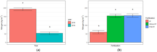 Nitrogen budget (kg ha−1) (a) in 2018 and 2019; (b) under different fertilization strategies, namely fresh faba residues (FF, no fertilized control), farmyard manure (FYM+FF), and vegetable compost (VEGco+FF). Treatments indicated by different letters are significantly different at p < 0.05 (Tukey test). Bars denote standard errors of the mean.