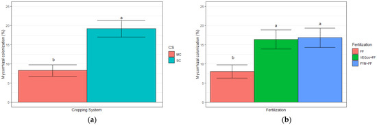 Mycorrhizal colonization (%) under (a) monocropping (MC) and strip-cropping (SC) in 2018 and 2019; (b) different fertilization strategies, namely fresh faba residues (FF, no fertilized control), farmyard manure (FYM+FF), and vegetable compost (VEGco+FF). Treatments indicated by different letters are significantly different at p < 0.05 (Tukey test). Bars denote standard errors of the mean.