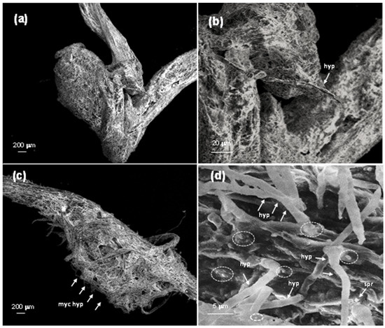 Comparison of faba bean nodules under MC and SC (fertilization: VEGco+FF, 4 June 2019). Nodule on MC faba bean roots, Mag 250X (a); isolated mycorrhizal hypha on MC faba bean nodule, Mag. 750X (b); nodule on SC faba bean, covered by mycorrhizal hyphae, Mag 250X (c); surface of active root nodule of SC faba bean, colonized by rhizobia and mycorrhizal fungi, Mag 1.5KX (d). myc hyp = mycorrhizal external hyphal mycelium; hyp = mycorrhizal external hypha; spr = mycorrhizal spore. Dashed circles identify rhizobia colonization on faba bean nodule.