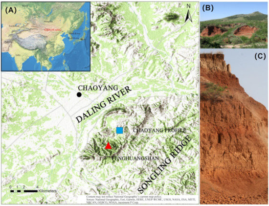 (A) A schematic map presenting the location of the Chaoyang loess–paleosol profile. The inset map shows the location of Chaoyang in China. The schematic map was plotted based on the base map of the World Topographic Map (2016) using Arc GIS 10.2.2. (B) An associated landscape photo of the Chaoyang loess–paleosol profile. (C) A photo of the Chaoyang loess–paleosol profile.