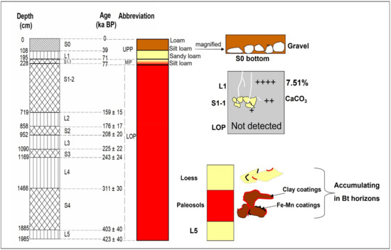In the UPP, the soil texture gradually transitioned from loam on the surface to silt loam (S0) to sandy loam towards the bottom (L1) (Figure 2). However, the texture for the MIP (S1-1, 195–228 cm) changed to silt loam—like S0—which seemed to indicate water-reworking during the formation of S0 and L1. These textural changes indicated a complex formation process of the UPP, especially at the L1–S1-1 boundary transition, as also evidenced by the color changes. The dull orange-brown color observed in S0 transitioned to the pale yellow-orange color in L1, followed by an abrupt color alternation from 10YR to 2.5YR at 228 cm and then to 5YR in the LOP. The uniform silt in the LOP (228–1985 cm) was associated with bright red-brown to orange colors (2.5YR). There were also greater amounts of clay and Fe-Mn coatings in the Bt horizons, especially in the paleosol layers. A maximum CaCO3 content of 7.51% was detected in L1. Some CaCO3 had leached from L1 and been deposited in underlying MIP as pseudomycelium and CaCO3 powder accumulations along structural ped faces (Figure 2).