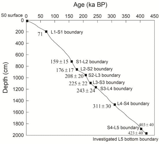 Ten dating samples at the boundaries of adjacent layers in the Chaoyang profile were used to characterize the sediment age. The age for the sample at 108 cm depth (S0 to L1 boundary) was determined by optically stimulated luminescence dating, and electron spin resonance dating was used for the remaining samples. The time span of the profile ranged from 0 to 423 ka BP. The S0 and L1 layers were deposited during the last ice age to the Holocene period. The S1 formation stage corresponded to the last interglacial period. The layers L2 to L5 formed during the second glacial–interglacial period in the mid-Pleistocene. A susceptibility age model [31] was used to address the chronology of the Chaoyang profile (Figure 3). According to the dating data, the Chaoyang profile had been continuously deposited, including various soil types exposed at the surface.