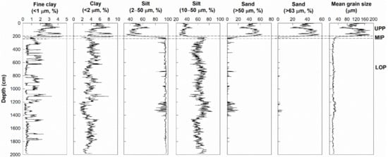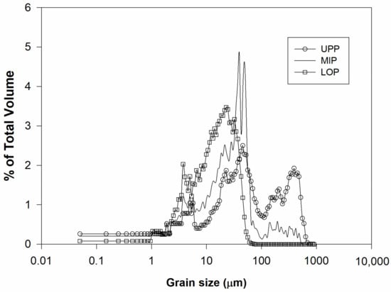 Furthermore, the UPP was poorly sorted for a wide grain size range (0.1–683.5 μm) and showed multi-modal domains of 2–6 μm, 20–70 μm and 120–555 μm in the grain size distribution frequency curve (Figure 5) indicating a complex formation process. The coarse particle domain of 20–70 μm for typical aeolian loess [36], which accounted for 45% of the accumulative total volume, had the greatest peak domain and represents easily wind-suspended fractions subject to short-distance transport [37]. The secondary peak domain of 120–555 μm, which accounted for 20% of the accumulative total volume beyond the aeolian loess domain, was indicative of a siltation process which is typical for 200–400 μm [38]. The third peak domain of 2–6 μm, which accounted for 30% of the accumulative total volume, was the fine grain domain of aeolian loess and could have been transported by wind for long distances [37,38].
