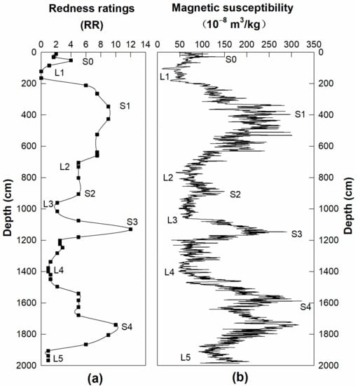 The morphological characteristics of the Chaoyang profile are described in Table 1. The profile was 19.85 m deep. No evidence of human influence or accelerated erosion was found in the field. The first top layer of the Chaoyang profile was S0, the brown zonal soil layer (Cinnamon soil, classified as Haplustalfs according to U.S. Soil Taxonomy [33]). Underlying S0, four reddish stratigraphic layers (S1–S4) were found interbedded with five yellowish stratigraphic layers (L1–L5) (Figure 2). The separating boundaries between adjacent layers were clear.