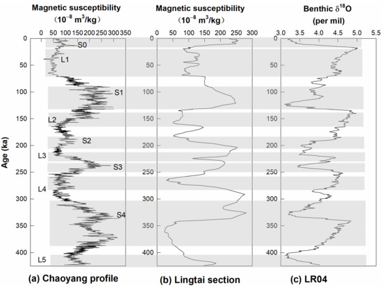 The multiple paleoclimate cycles recorded in the Chaoyang profile were well correlated to the benchmark profile of the Lingtai section from the China Loess Plateau and LR04 benthic δ18O [51] (Figure 8). This supported the Chaoyang profile being a benchmark paleosol profile in Northeast China.