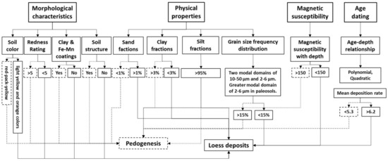 Flow chart for distinguishing between paleosols that have undergone some degree of pedogenesis and loess deposits with less pedogenesis for the Chaoyang profile.
